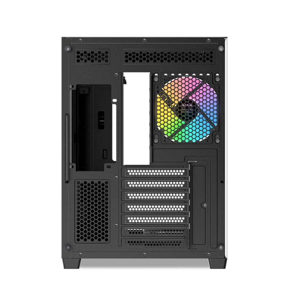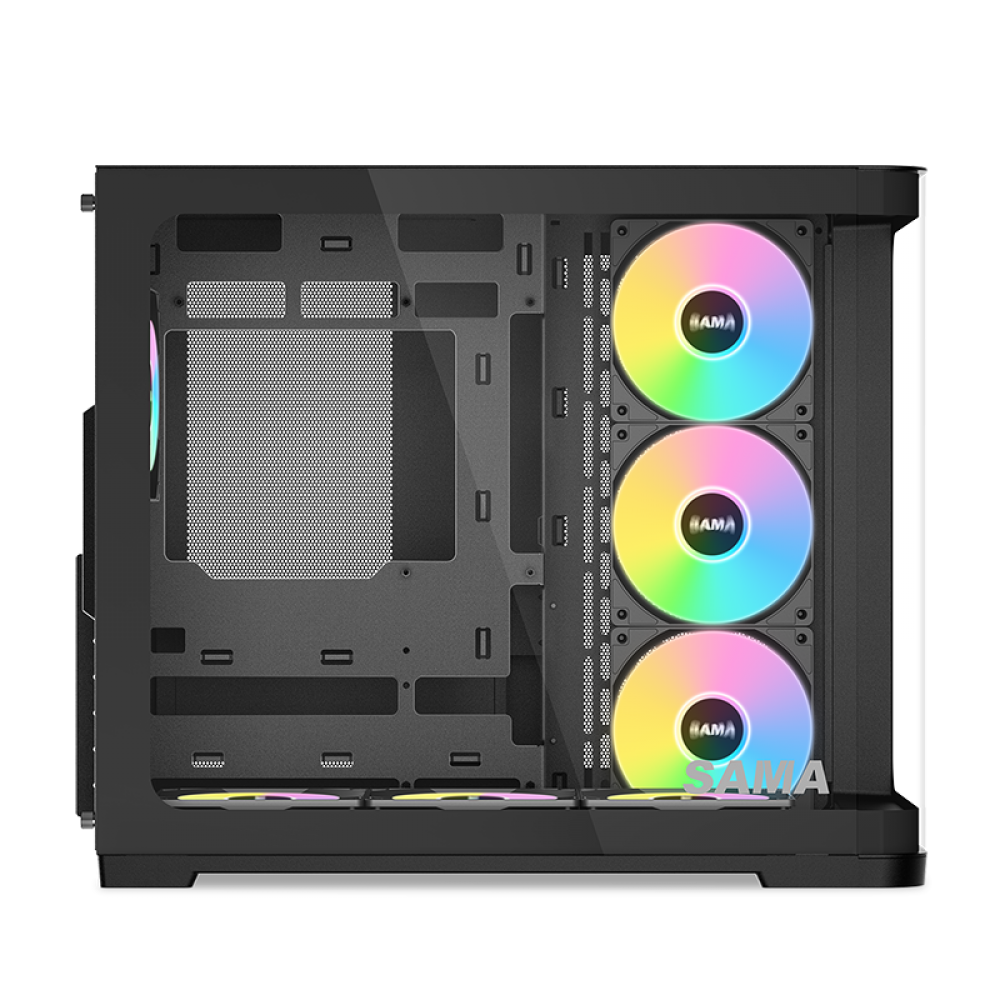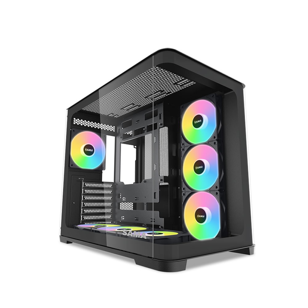 Корпус SAMA V60 демонстрирует стильный двухкамерный дизайн с элегантно изогнутой передней панелью для привлекательного современного вида. Правая боковая панель оснащена двумя большими сеточными секциями, что улучшает воздушный поток и обеспечивает совместимость с 10 вентиляторами для впечатляющей мощности охлаждения. Такое сочетание эстетики и высокопроизводительной функциональности делает корпус V60 идеальным выбором для сборки, в которой приоритет отдается как внешней привлекательности, так и эффективности охлаждения.