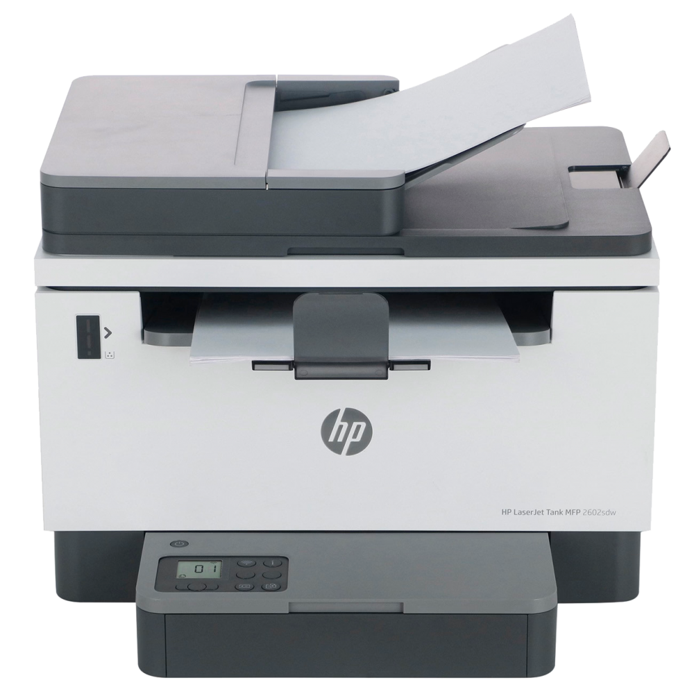 Лазерное МФУ HP LaserJet Tank MFP 2602sdn 2R7F6A с разрешением печати встроенного копира 600х600 т/д монохромного типа обеспечивает производительность до 25000 стр/мес.