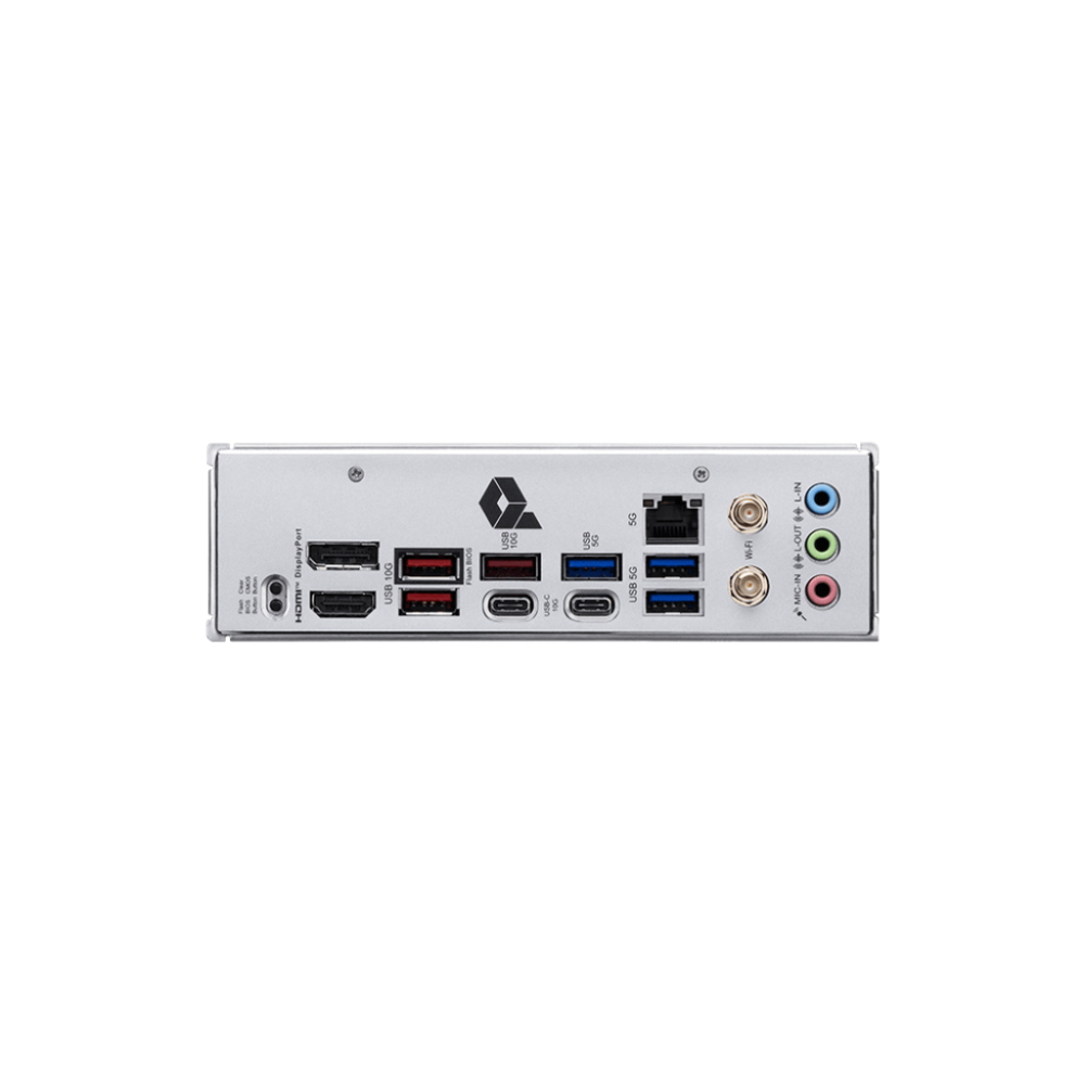 Плата оснащена современными интерфейсами, включая порты USB 3.2 Gen 2x2 Type-C, HDMI 2.1 и DisplayPort 1.4, обеспечивая высокоскоростную передачу данных и поддержку 4K-разрешения. Также имеется разъём RJ-45 для подключения к сети Ethernet.