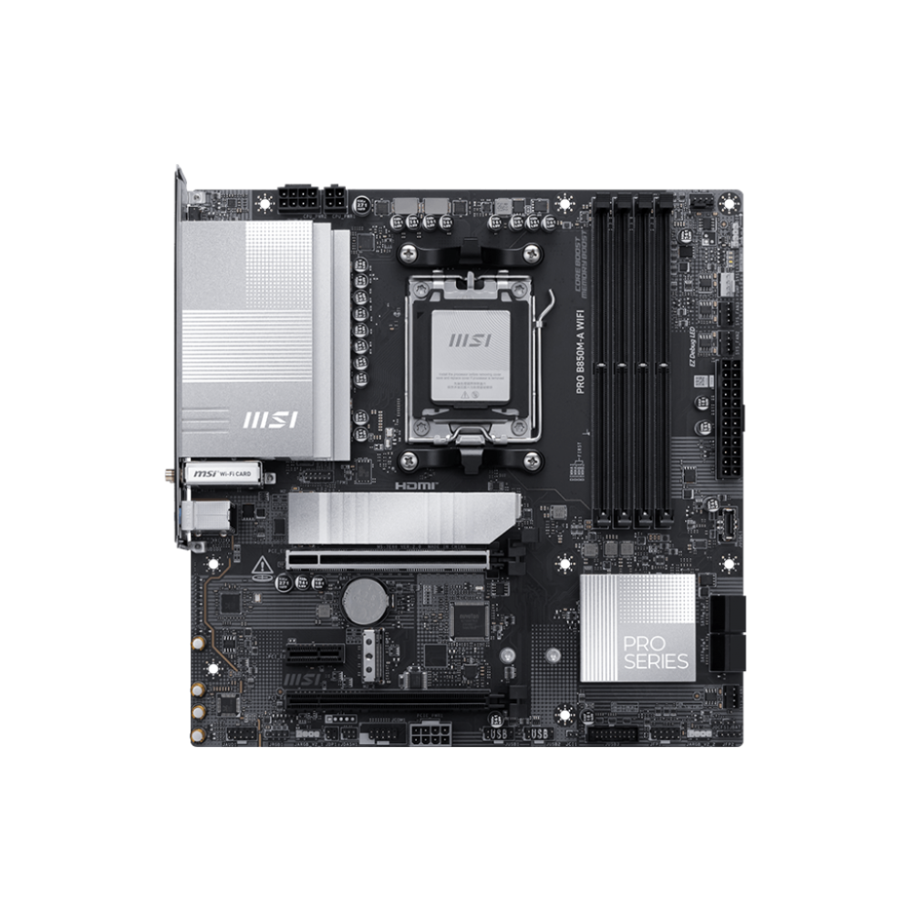 MSI PRO B850M-A WIFI — это материнская плата формата Micro-ATX, предназначенная для процессоров AMD Ryzen™ 7000, 8000 и 9000 серий с сокетом AM5. Она сочетает в себе передовые технологии, высокую производительность и надежность, что делает её отличным выбором для рабочих станций, серверов и домашних ПК.