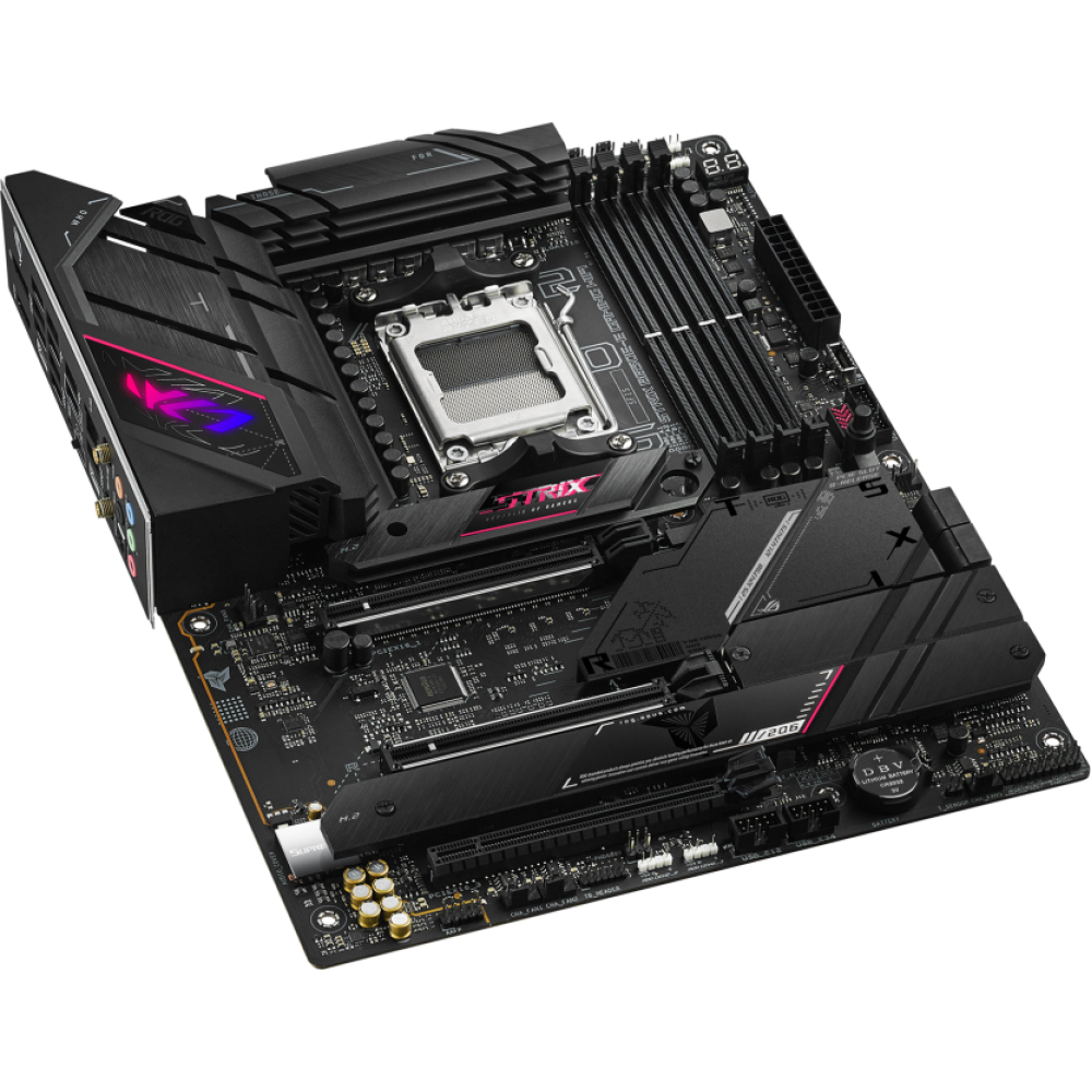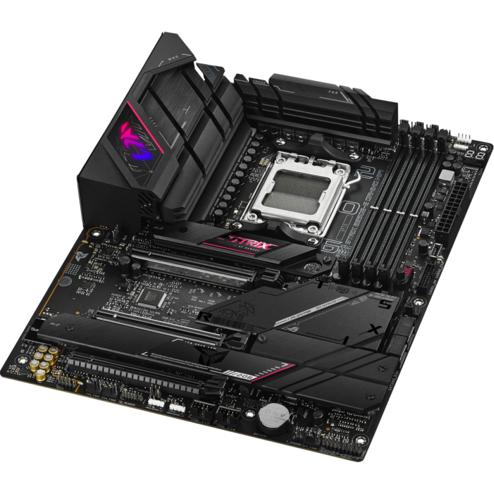 Смелый и элегантный, ROG Strix B650E-E обладает премиальной эстетикой, аналогичной серии периферийных устройств Electro Punk. Черные кожухи закрывают твердотельные накопители и набор микросхем с контрастной текстурой из матового металла с порошковым покрытием, а игривые розовые акценты привлекают внимание к плате. Кожух ввода-вывода украшен разделенным изображением глаза ROG, центр которого может сиять всплеском настраиваемого RGB.