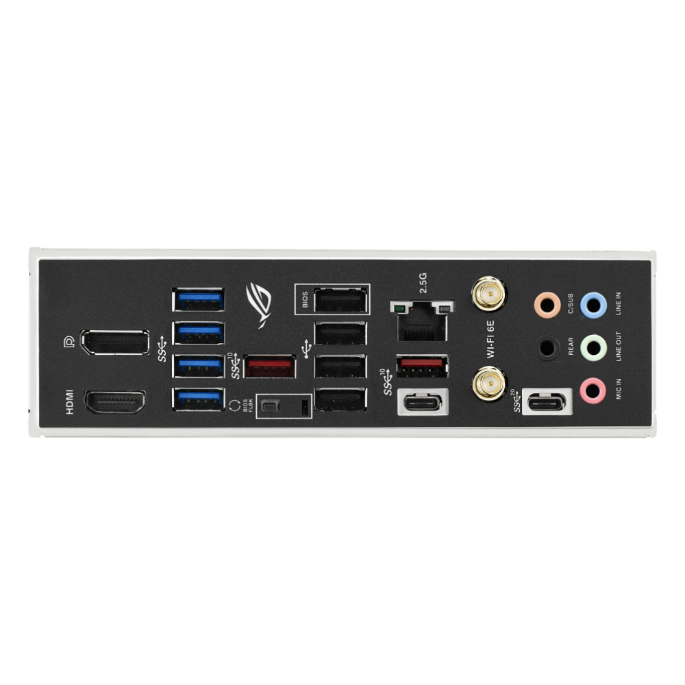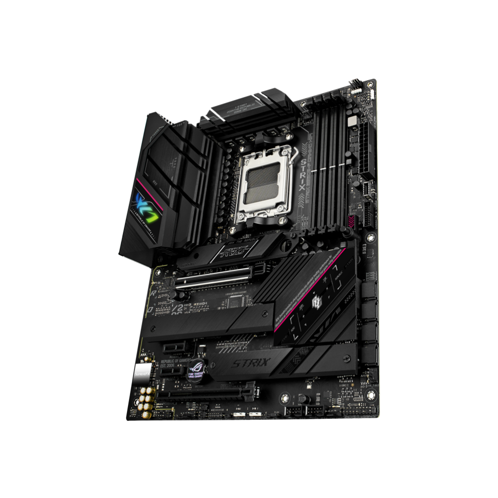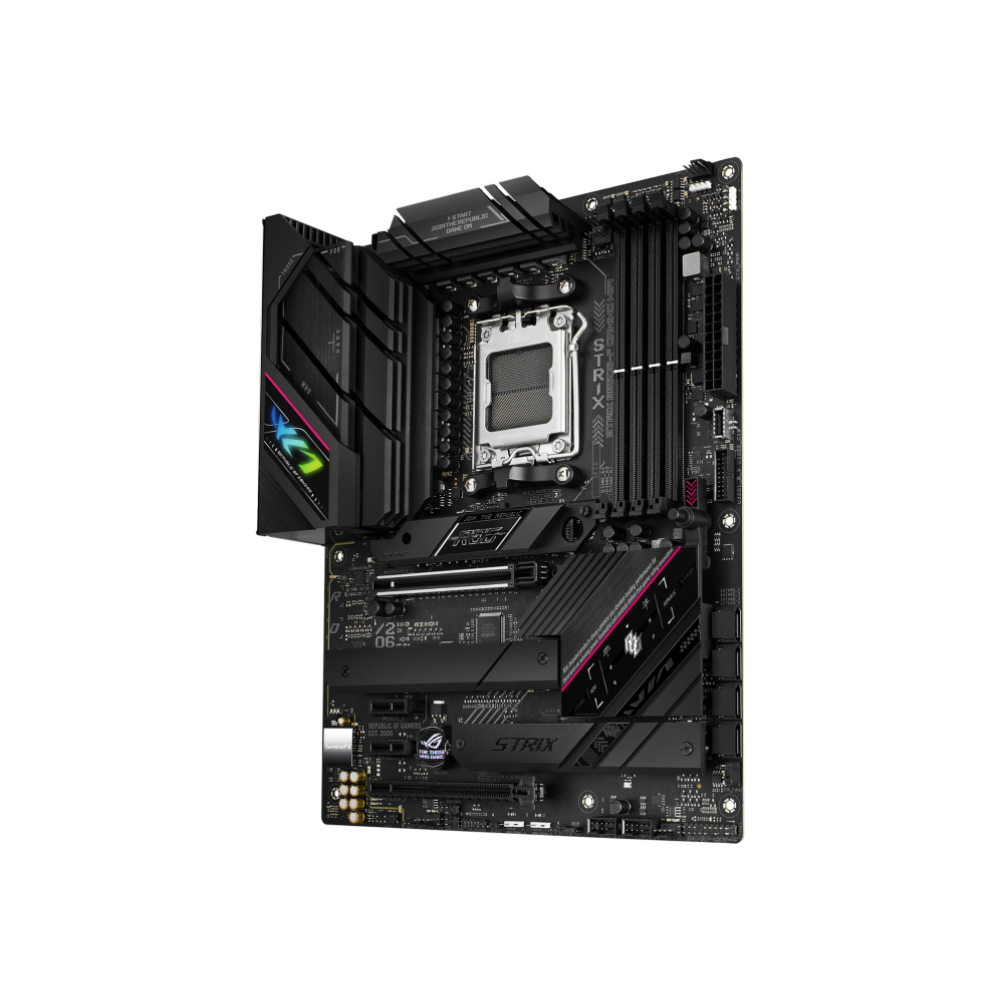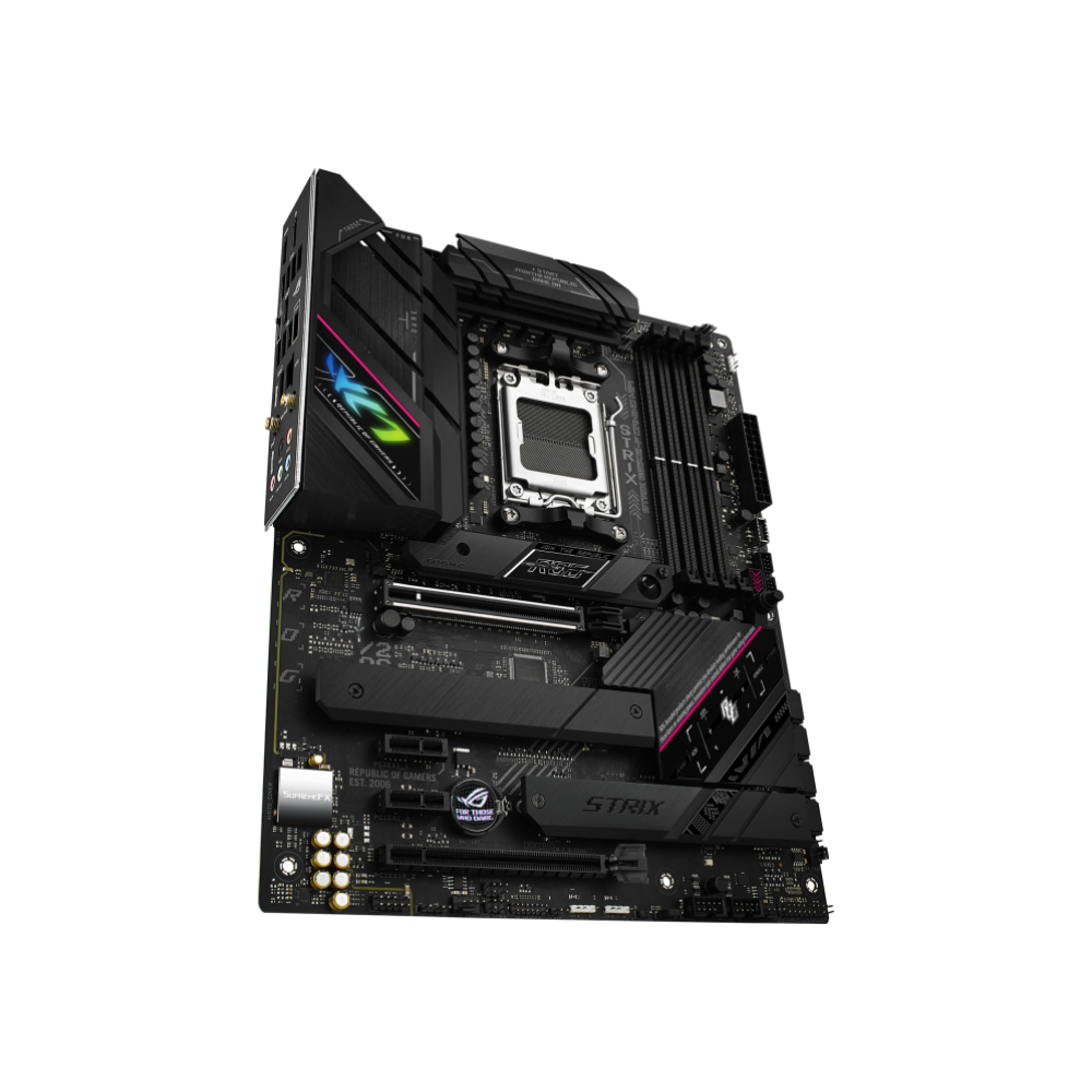 Смелый и элегантный, ROG Strix B650E-F обладает премиальной эстетикой, аналогичной серии периферийных устройств Electro Punk. Черные кожухи закрывают твердотельные накопители и набор микросхем с контрастной текстурой из матового металла с порошковым покрытием, а игривые розовые акценты привлекают внимание к плате. Кожух ввода-вывода украшен разделенным изображением глаза ROG, центр которого может сиять всплеском настраиваемого RGB.