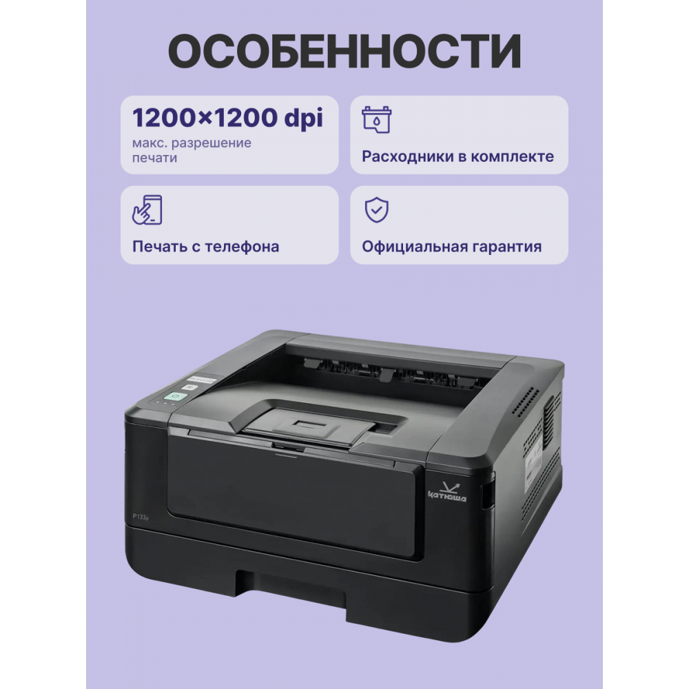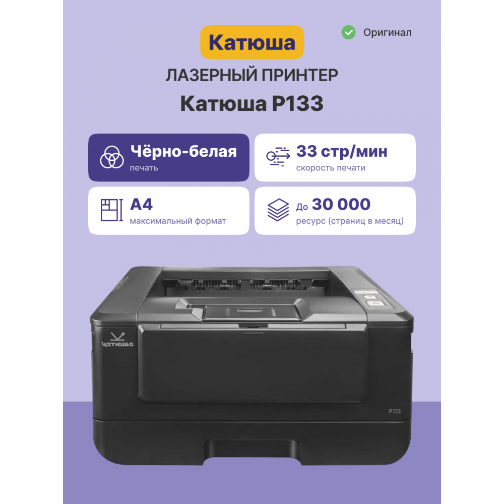 Принтер Катюша P133 — это высокопроизводительное устройство, предназначенное для монохромной печати. Он идеально подходит для офисов и домашних пользователей, которым требуется быстрая и качественная печать документов формата А4. Скорость печати 33 страницы в минуту и высокое разрешение 1200 dpi делают его отличным выбором для различных задач.