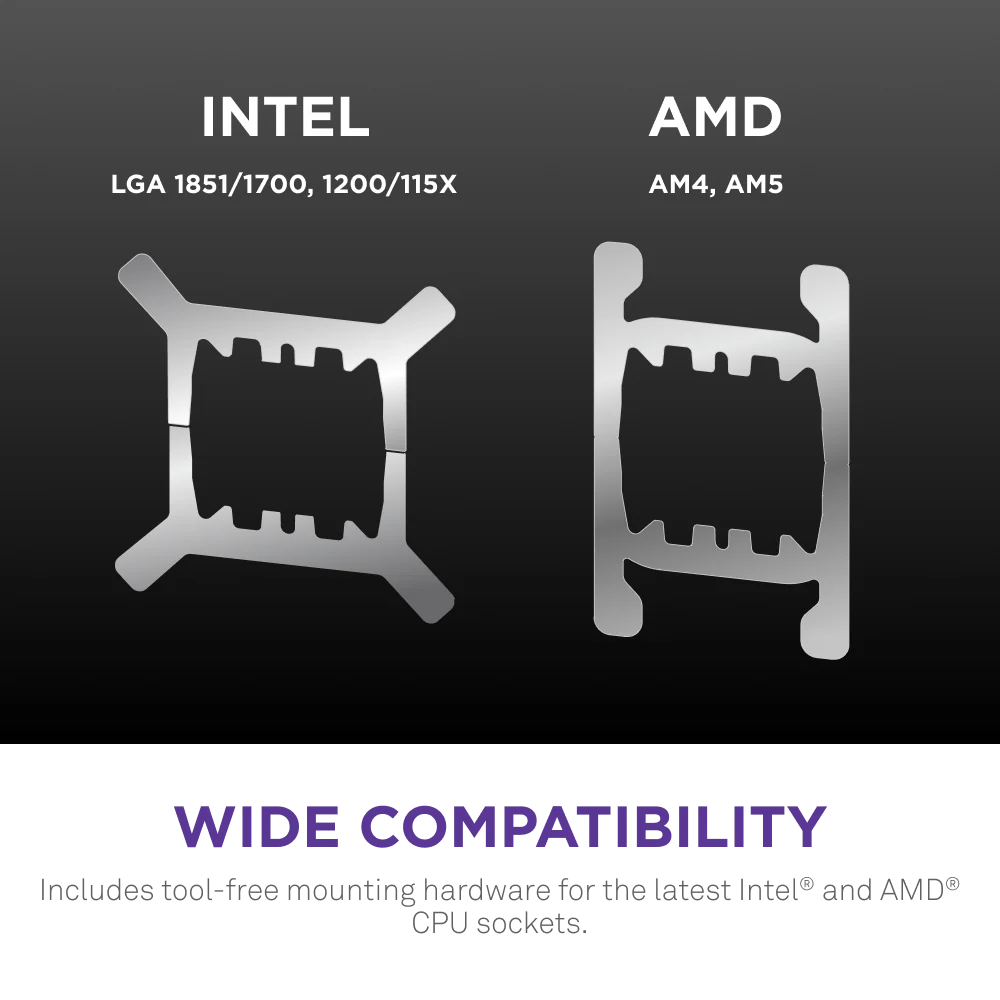 Система поддерживает актуальные сокеты процессоров: Intel 1851, 1700, 1200, 115X и AMD AM5, AM4, что делает её универсальным выбором для большинства современных платформ.