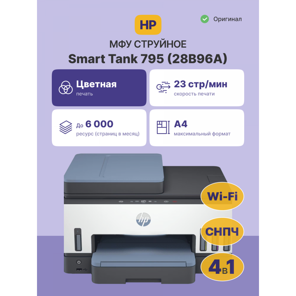 HP Smart Tank 795 All-in-One — многофункциональное устройство с цветной струйной печатью.