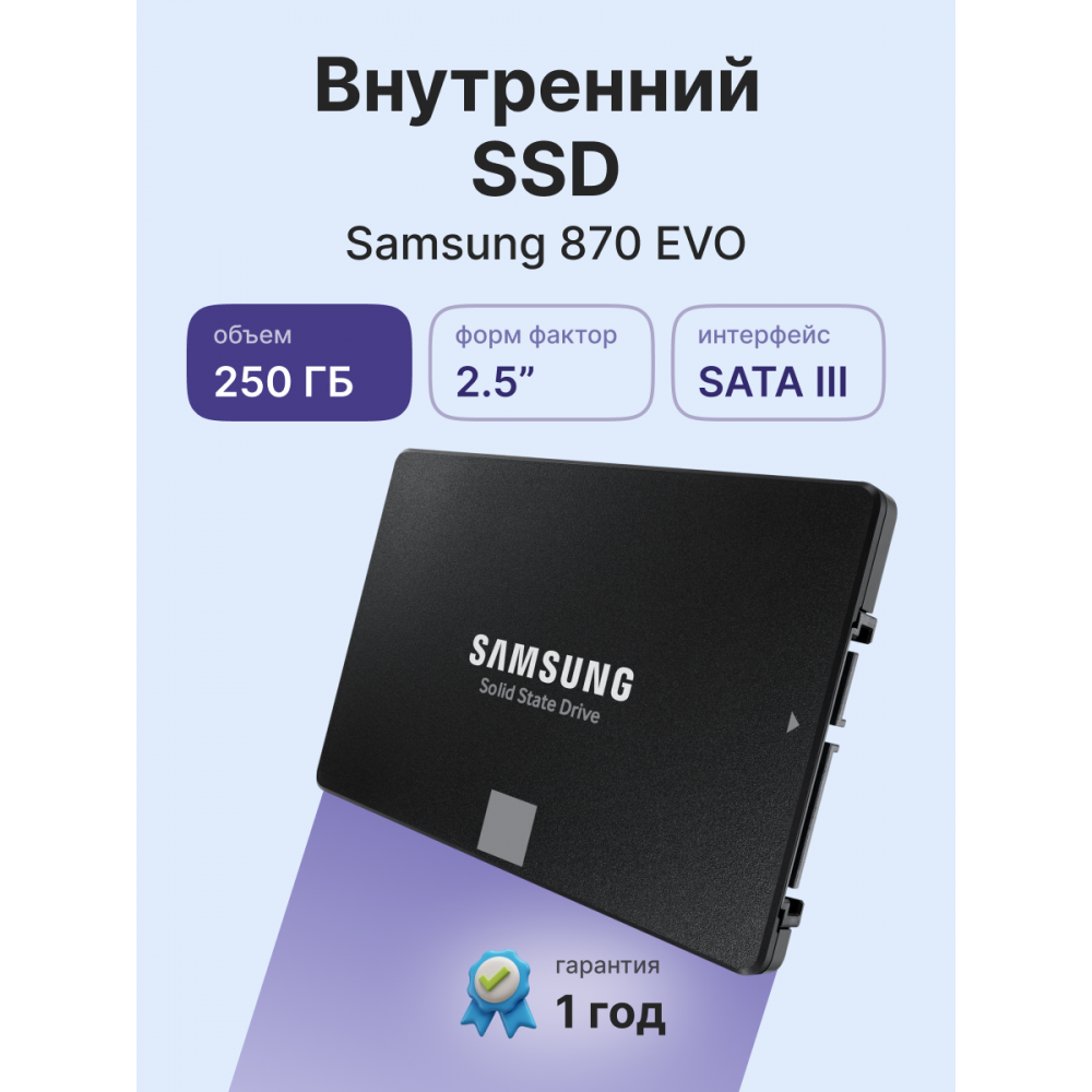 Технические характеристики Твердотельные накопители/ Samsung SSD 870 EVO, 250GB, 2.5" 7mm, SATA3, 3-bit MLC, R/W 560/530MB/s, IOPs 98 000/88 000, DRAM buffer 512MB, TBW 150, DWPD 0.33 (12 мес.) Samsung Electronics