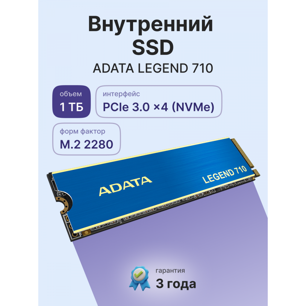 Технические характеристики Твердотельный накопитель/ ADATA SSD LEGEND 710, 1024GB, M.2(22x80mm), NVMe 1.4, PCIe 3.0 x4, 3D NAND, R/W 2400/1800MB/s, IOPs 180 000/150 000, TBW 260, DWPD 0.23, with Heat Sink (3 года) ADATA