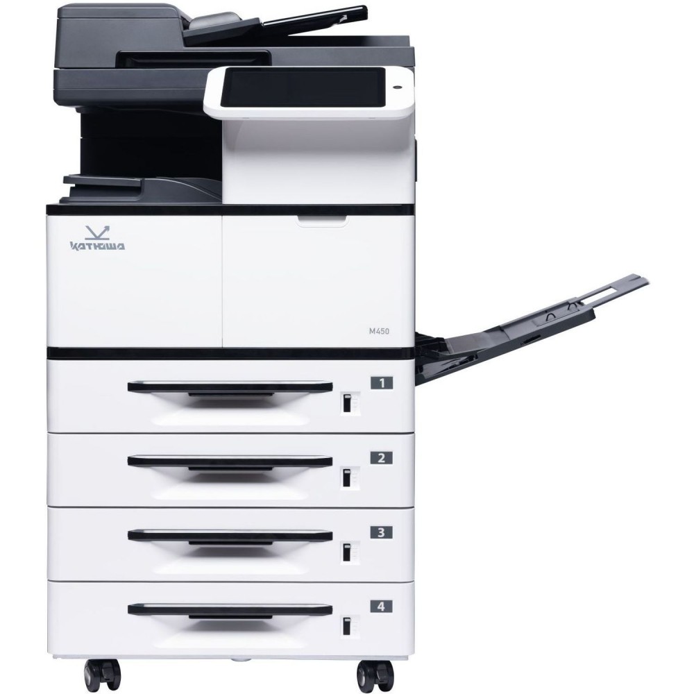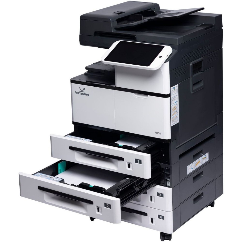 В РЕЕСТРЕ МПТ; Произведено в России, российские материнские платы! МФУ Катюша М450pm (А3, МФУ лазерный C/P/S(цв)/F(опция), Ч/Б, Скорость печати А4 50 стр/мин, Дуплекс А4 34 стр/мин, Скорость печати А3 28 стр/мин, Дуплекс А3 18 стр/мин; Макс. разрешение печати 1200х1200 dpi; процессор 1,2 ГГц (4 ядра), оперативная память 4 ГБ RAM; Вместимость лотков подачи 1100 листов (2 х 500 + 100 листов), максимальная вместимость лотков подачи 2100 листов ((500 + 500 встроенные)+ (500 + 500 опциональная тумба)+100 ручная подача) , обходной лоток 100 листов, выходной лоток 500 листов; Диапазон поддерживаемых плотностей носителя 45 – 300 г/м2; Сканирование цвет глубина 24 бит (8 бит на канал), Скросто сканирования-А4 до 80 стр/мин, скорость двустороннего сканирования (DADF) до 160/стр/мин; емкость DADF 130 листов, разрешение сканирования до 600 x 600 dpi (оптическое), до 1200 х 1200 dpi (интерполяция, с помощью утилиты); интерфейсы USB 2.0, USB Host 2.0, Ethernet (10/100/1000 MB) , Wi‐Fi (802.11 b/g/n) (опция), Факс (опция; языки описания страниц GDI / PCL6 /PS3 (эмуляция)/PDF; поддерживаемые ОС: Win, Win Server, Linux (By CPU x86_64/i386/aarch64), Mac OS (в разработке), Unix (не тестировалось), Astra Linux (Поддерживается Нет сертификации), Ред ОС, Альт 8СП (Поддерживается Нет сертификации), ЕМИАС ОС (не тестировалось); панель управления 318мм х 167мм, 10-ти дюймовая полноцветная сенсорная панель; Нагрузка: 15 000 стр/мес (рек)/220 000 стр/мес (макс); Тонер в комплекте на 10 000 отп. !!Unable to render embedded object: File (Запуск АСЦ не требуется (внутри инструкция по самостоятельному запуску), 3 года гарантии) not found.