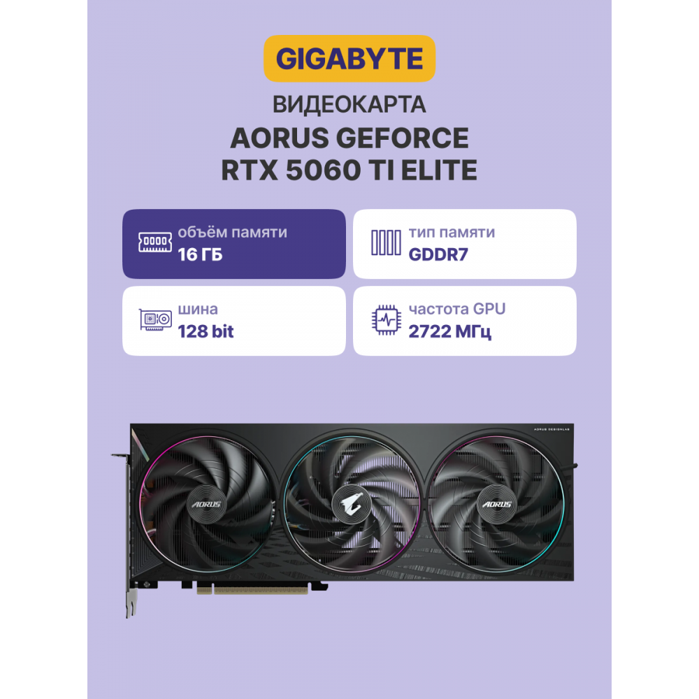 AORUS GeForce RTX 5060 Ti ELITE 16G оснащена 16 Гбайт видеопамяти GDDR7, что обеспечивает высокую скорость передачи данных и позволяет обрабатывать большие объемы информации. 128-разрядная шина памяти способствует эффективному использованию видеопамяти, улучшая общую производительность системы.